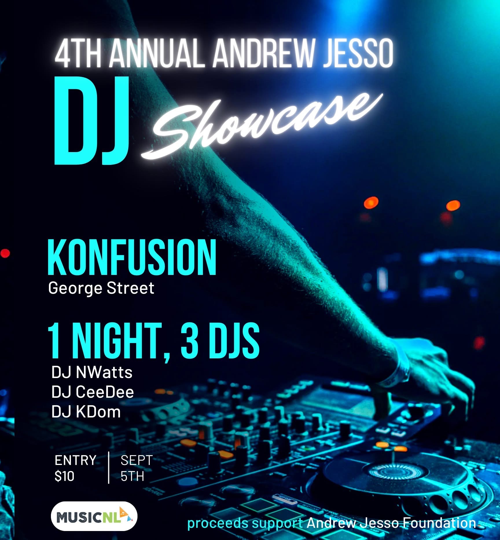 Get ready for an unforgettable time as we bring our highly anticipated DJ Showcase to George Street, St. John’s! On Friday, September 5th we are taking over Konfusion for our 4th Annual Andrew Jesso DJ Showcase, featuring 3 hot DJs who will keep the vibe going all night.