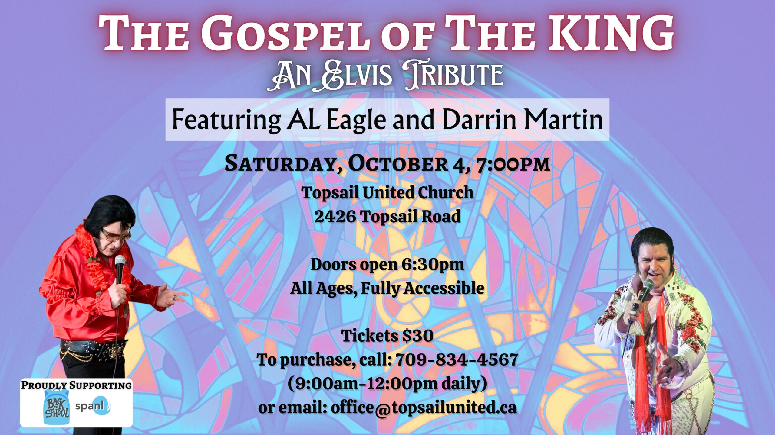 The Dynamic Duo, Elvis tribute artist Al Eagle and Darrin Martin, will be paying tribute to Elvis Presley’s love of gospel music. The New Date Is Saturday October 4, 2025 (Postponed Due to The Wild Fires). Show time is: 7:00 PM – Doors Open 6:30 PM at the Topsail United Church, 2426 Topsail Road, CBS.
