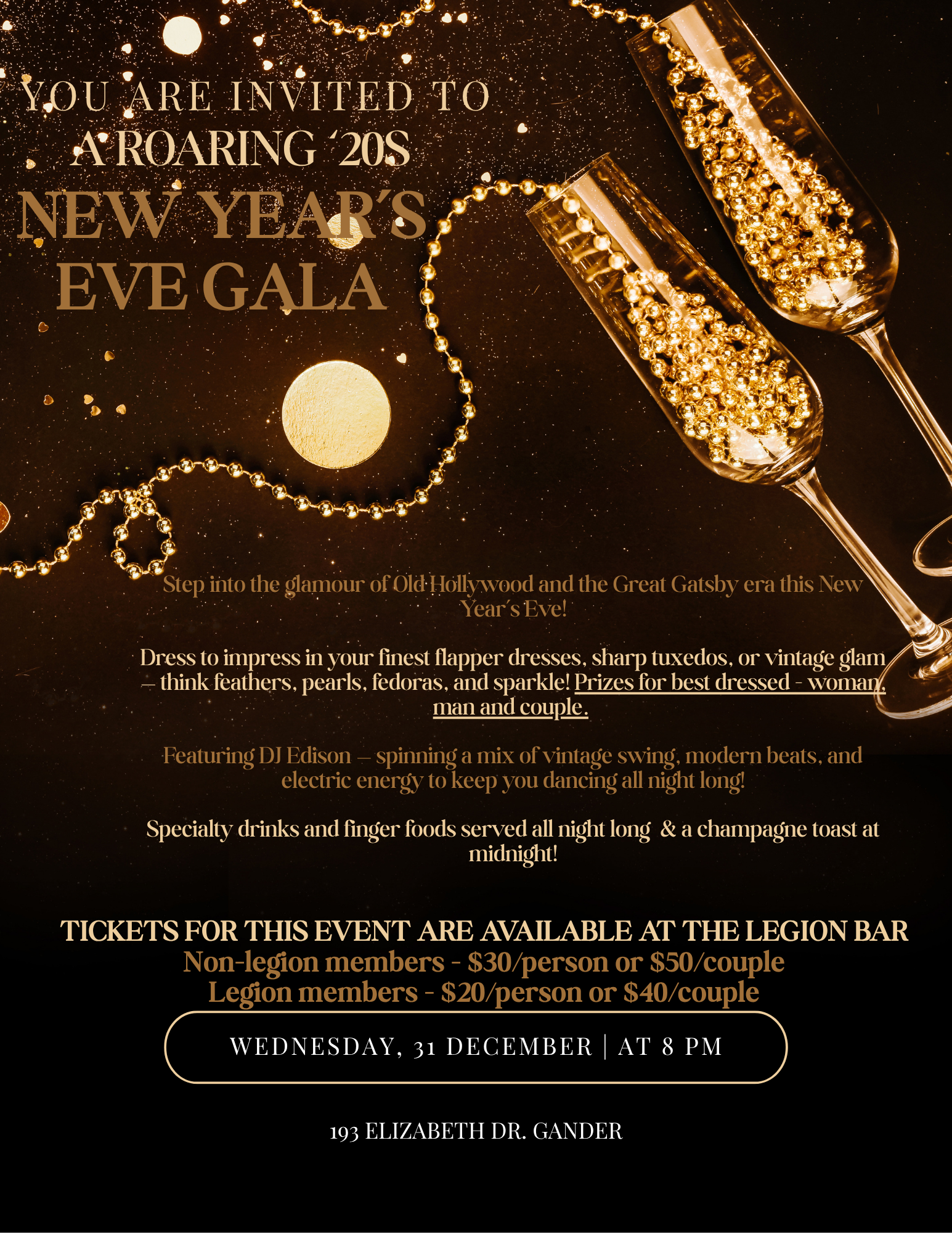Ring in 2026 with a Great Gatsby-inspired New Years Eve Gala at the Royal Canadian Legion in Gander. Show up in your best flapper dress or dapper tux – think feathers, pearls diamonds and champagne.