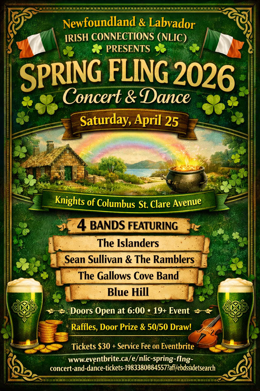 NLIC present a Concert and Dance at the Knights of Columbus on St. Clare Ave. Saturday April 25! 4 Bands with Headliners – The Islanders, Sean Sullivan and the Ramblers, Blue Hill and The Gallows Cove Band.