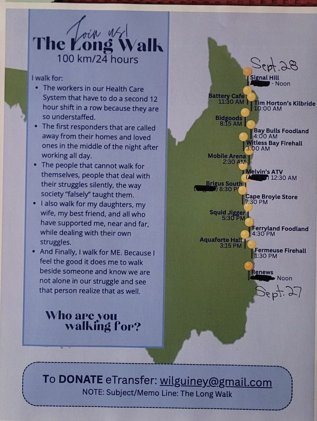 The Long Walk for mental health is taking place September 27th to 28th, to raise money for The Gathering Place and RUAH Counselling Centre. For the past decade, Bill Guiney has participated in a fitness challenge to raise funds and awareness for mental health initiatives in Newfoundland Labrador, including a walk from Port Aux Basques to Signal Hill in 2021. This year, he will be leaving Renews and arriving on top of Signal Hill around noon the next day. Cheer him along the route and contact wilguiney@gmail.com for donation info.
