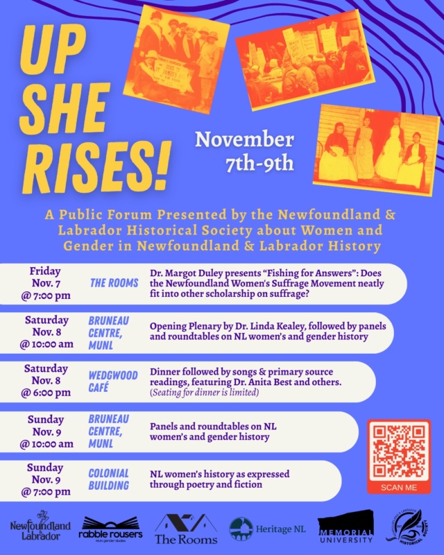 Join the Newfoundland and Labrador Historical Society from November 7 to 9 for three days of public forums on Women and Gender in Newfoundland and Labrador History. Inspired by the 100th anniversary of women’s suffrage in NL, Up She Rises! constitutes a public discussion about women and gender in NL history.